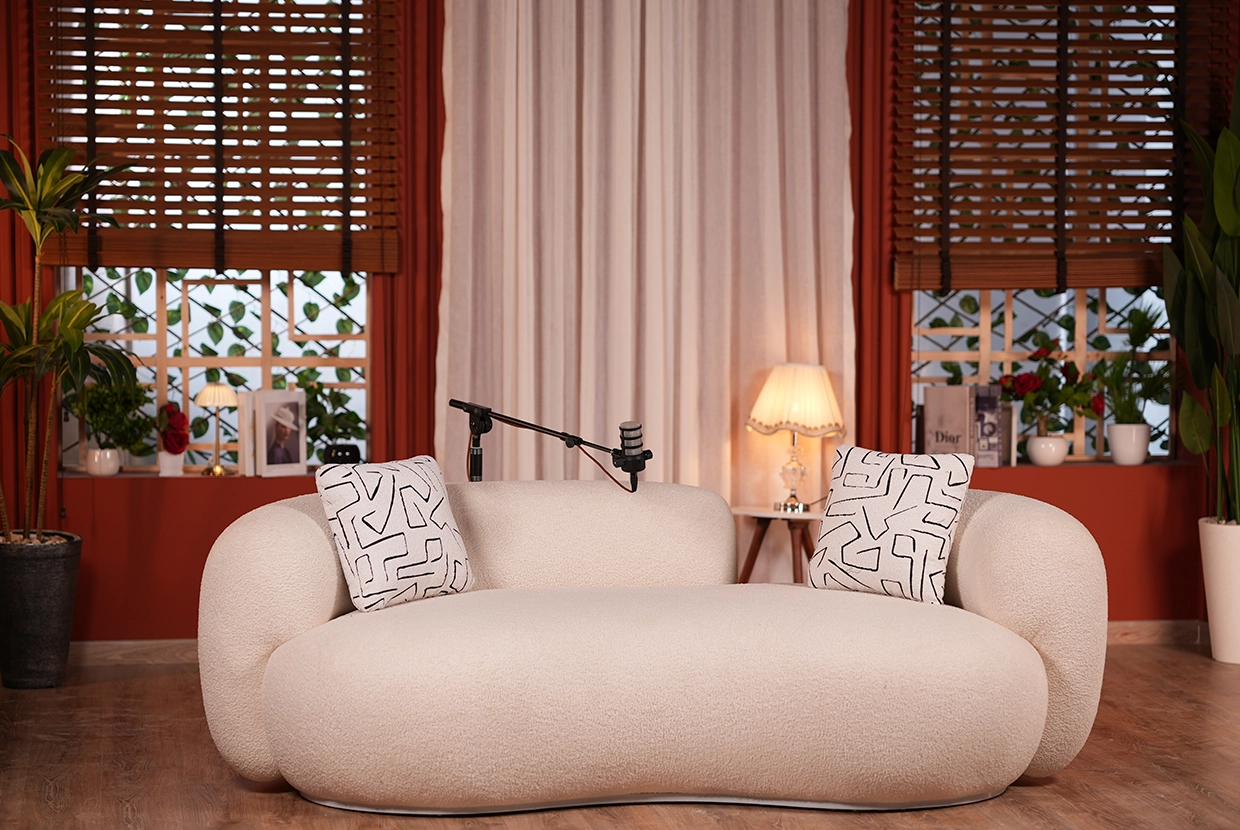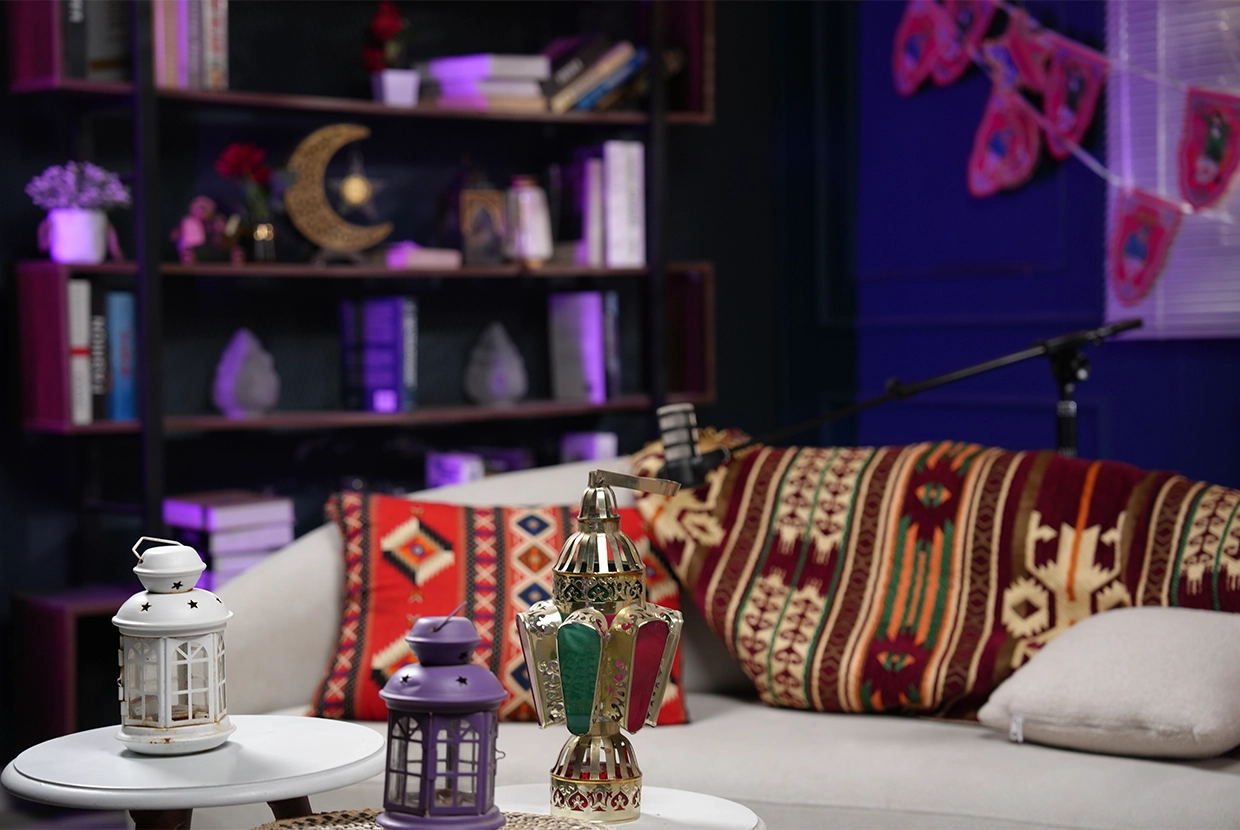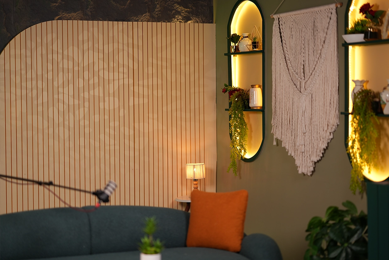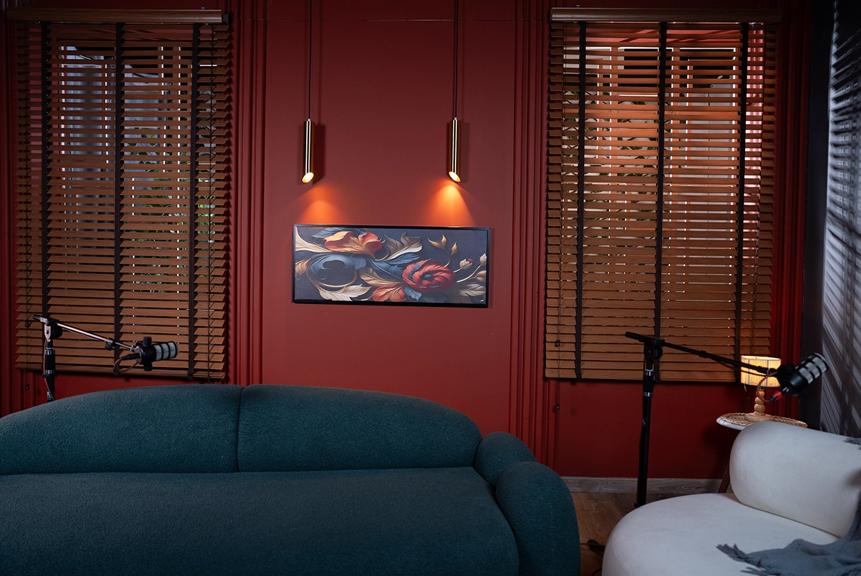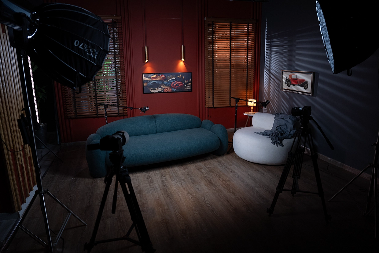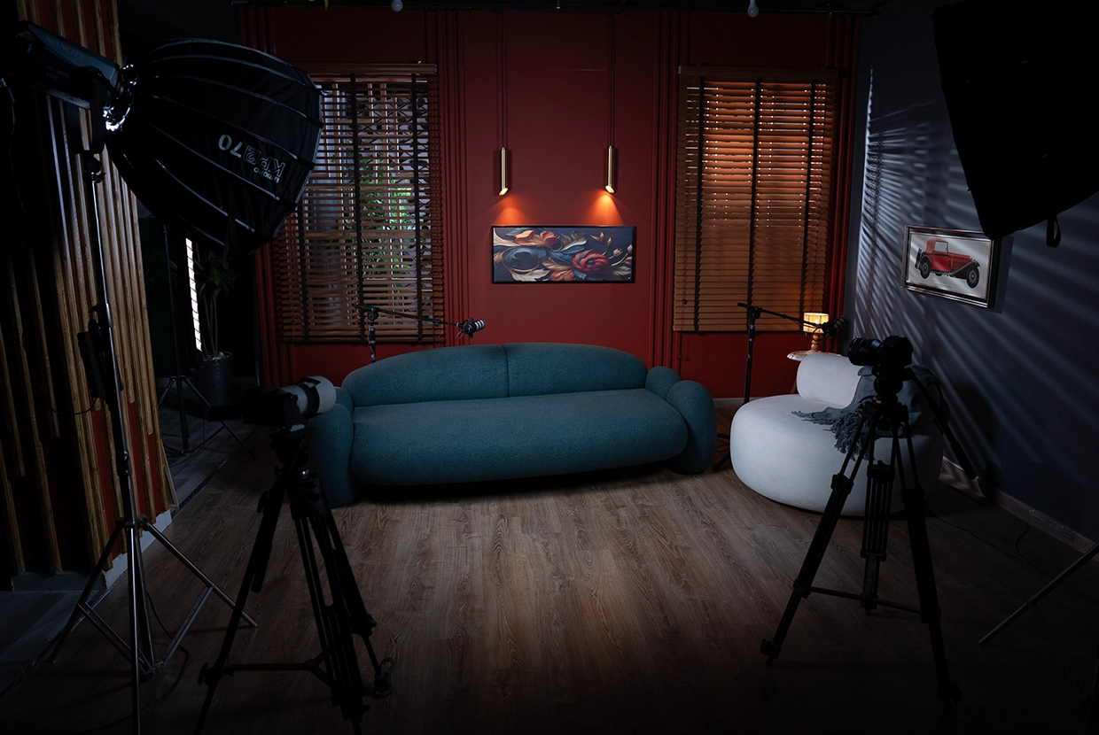 - We select the perfect location We have 8 completely different plateaus (from formal office setups to cozy living rooms to modern, colorful spaces with changeable lighting). We’ll choose the one that fits your concept—or customize it according to your needs.