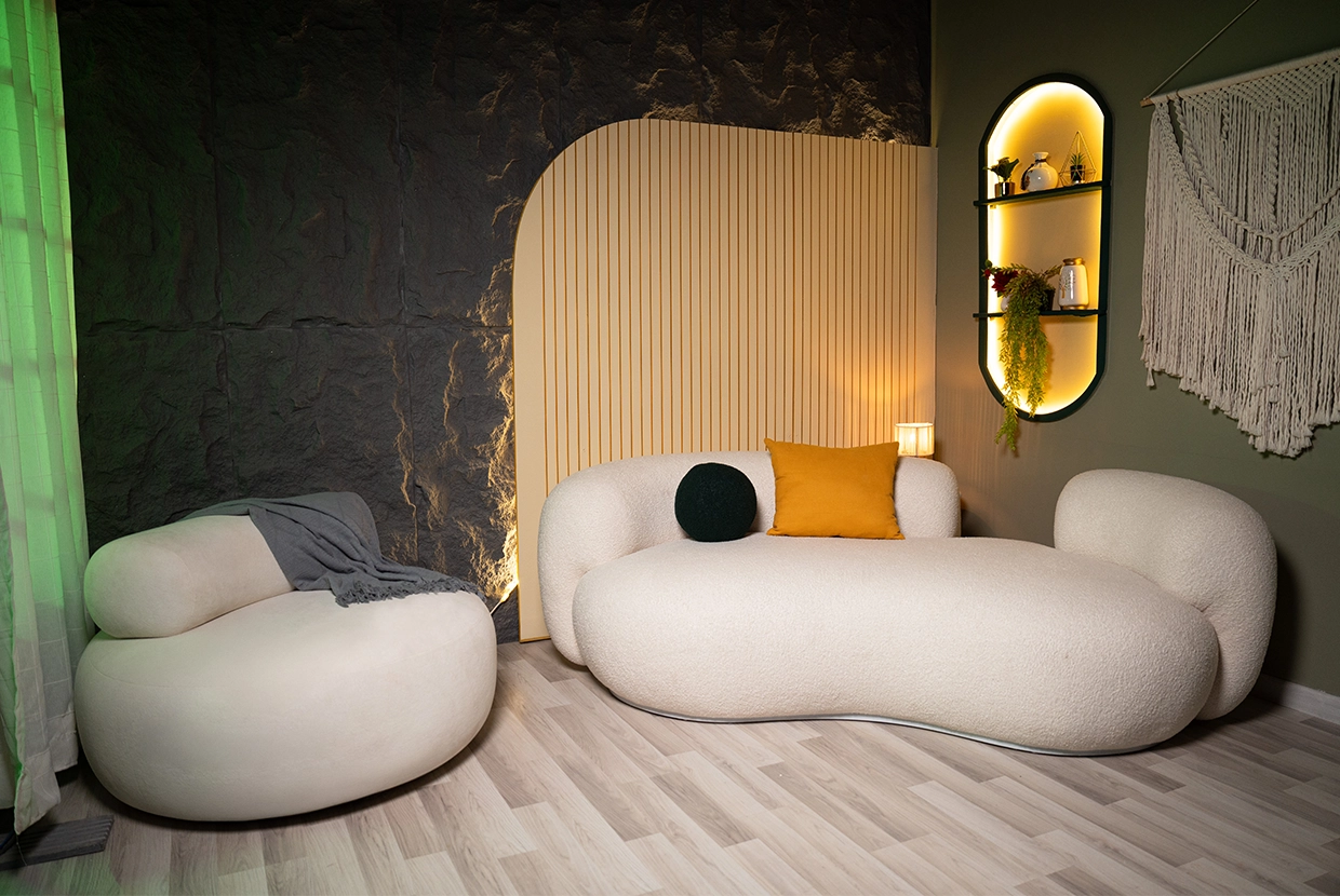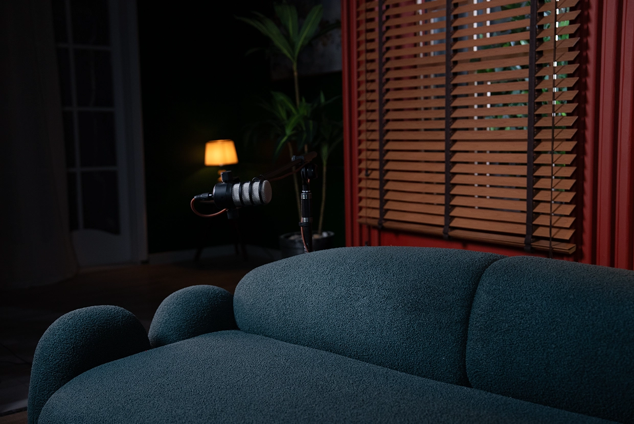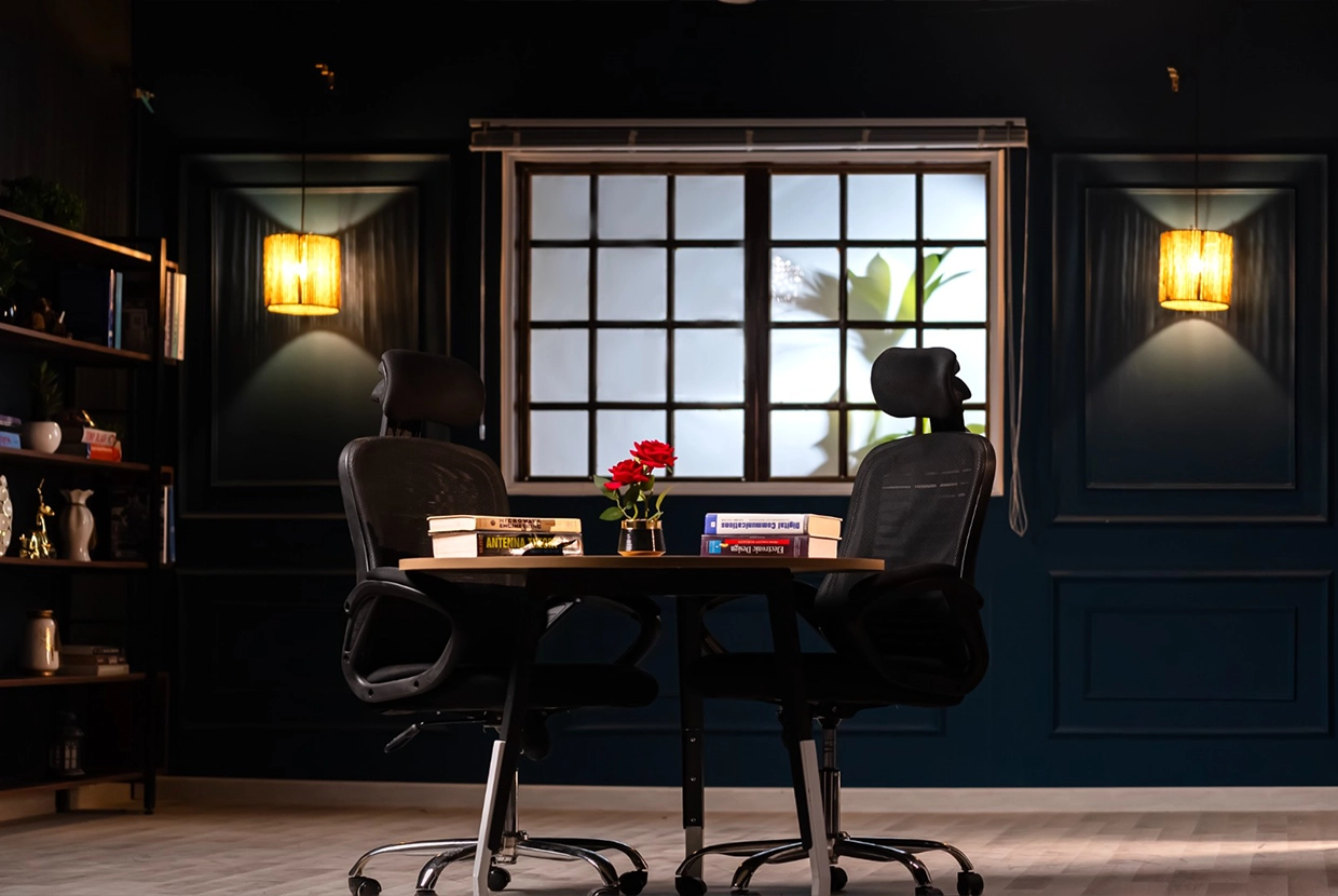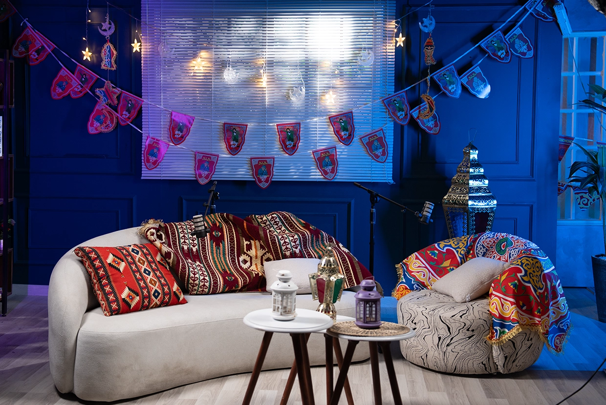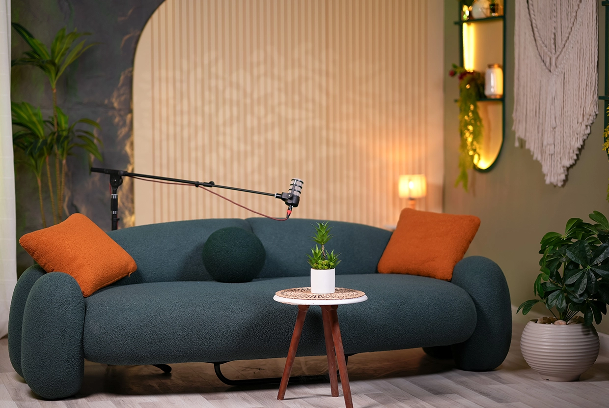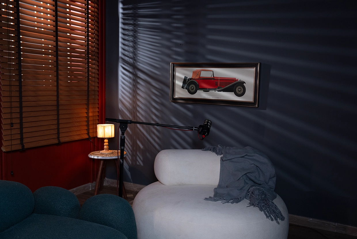 - We select the perfect location We have 8 completely different plateaus (from formal office setups to cozy living rooms to modern, colorful spaces with changeable lighting). We’ll choose the one that fits your concept—or customize it according to your needs.
