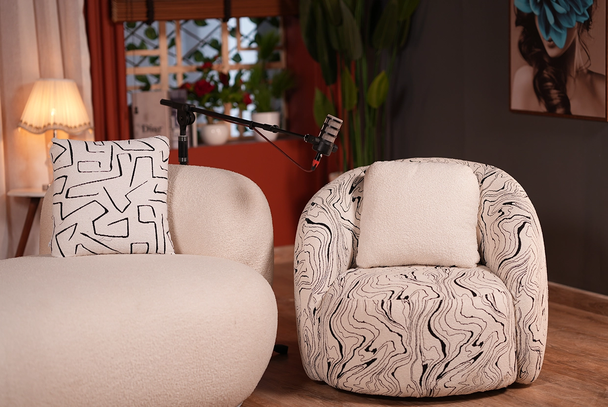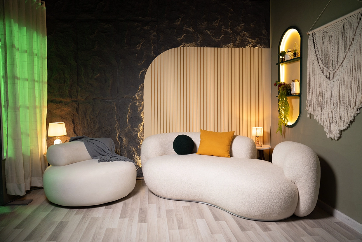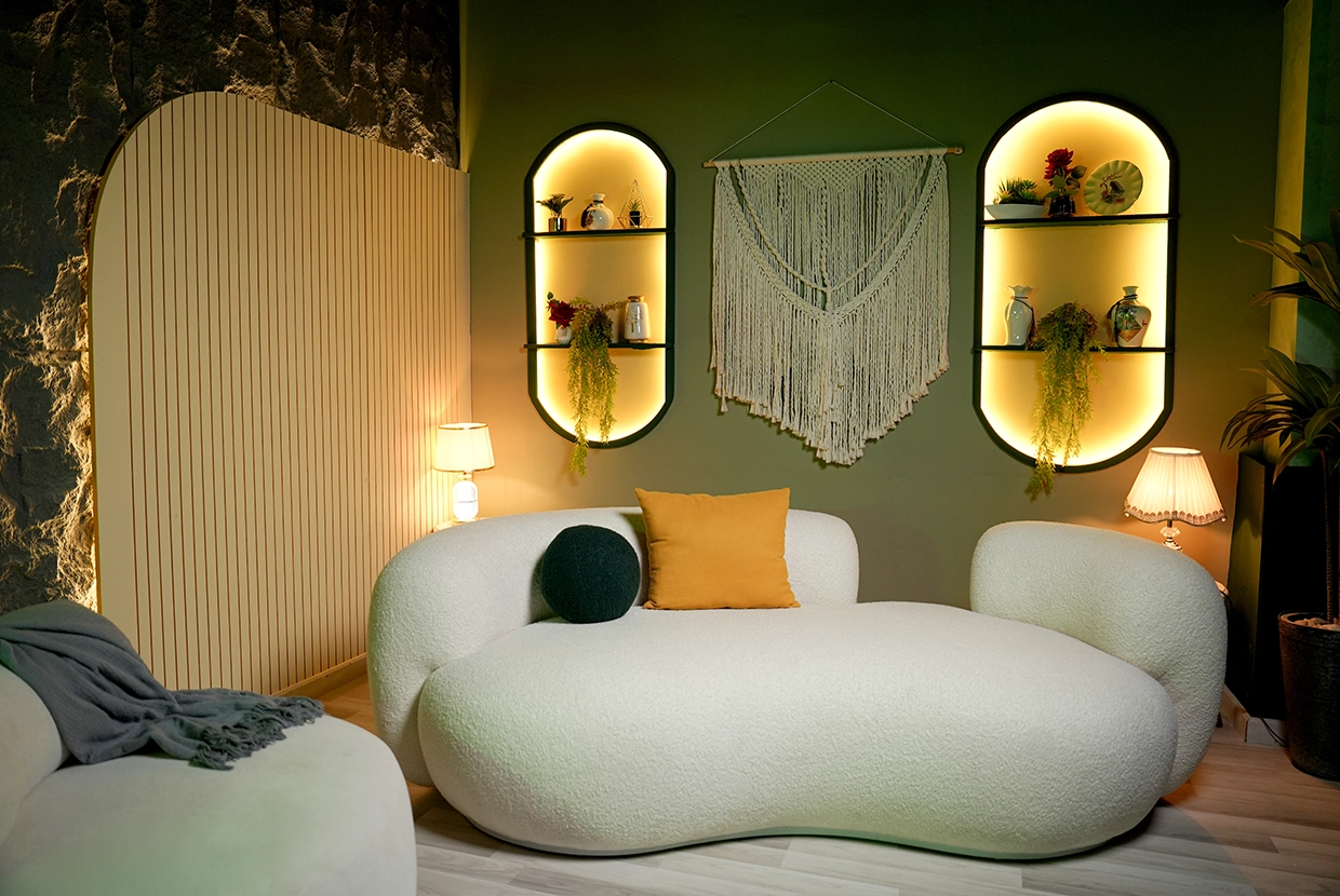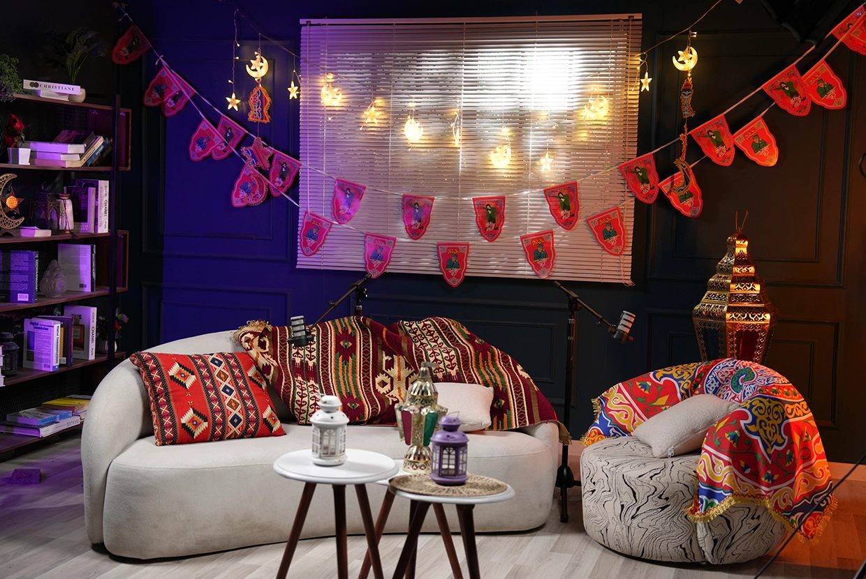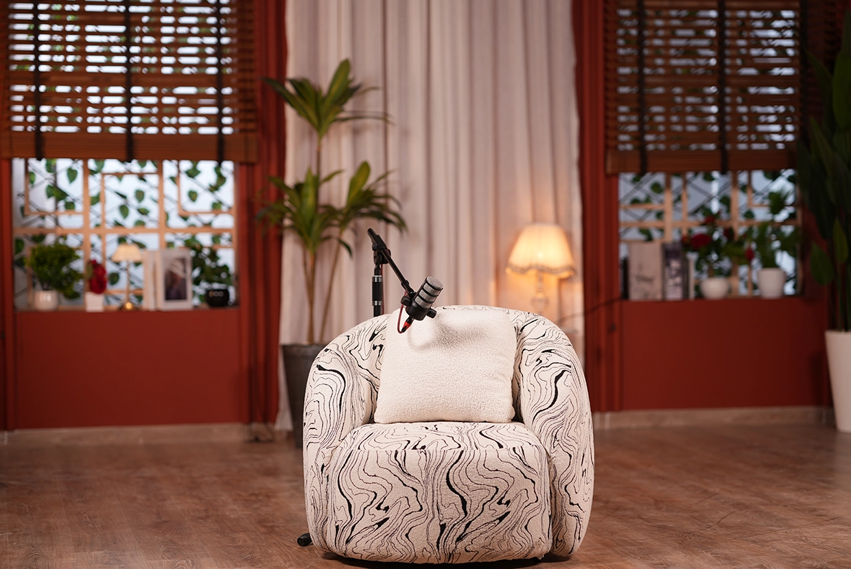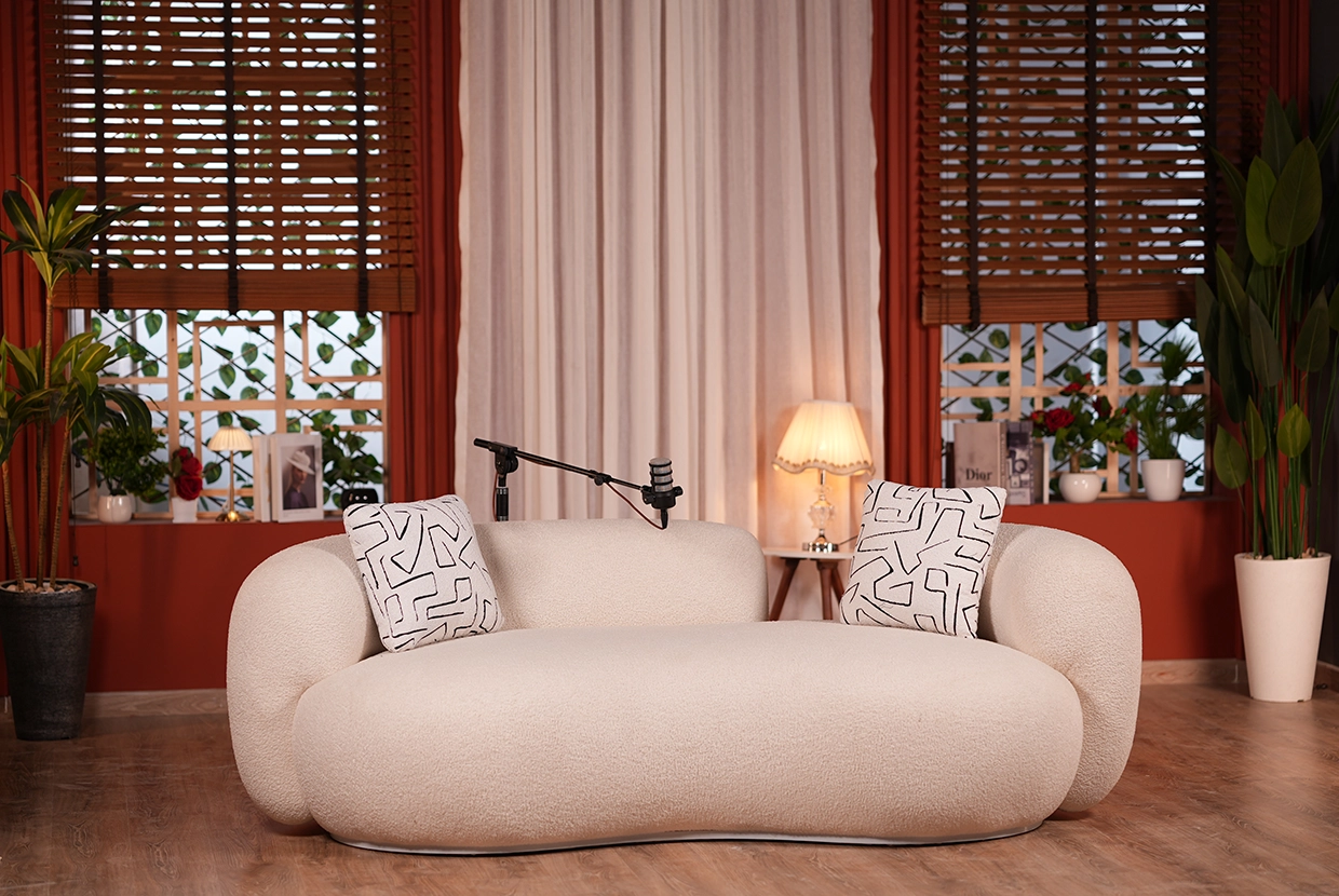 - We select the perfect location We have 8 completely different plateaus (from formal office setups to cozy living rooms to modern, colorful spaces with changeable lighting). We’ll choose the one that fits your concept—or customize it according to your needs.